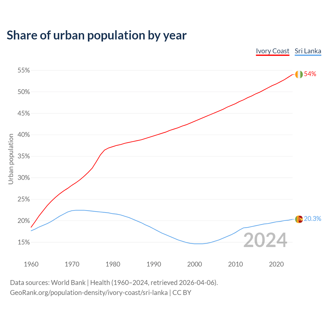 From 2004 to 2024, the share of urban population changed from 44.7% to 54% in Ivory Coast and from 14.9% to 20.3% in Sri Lanka.
