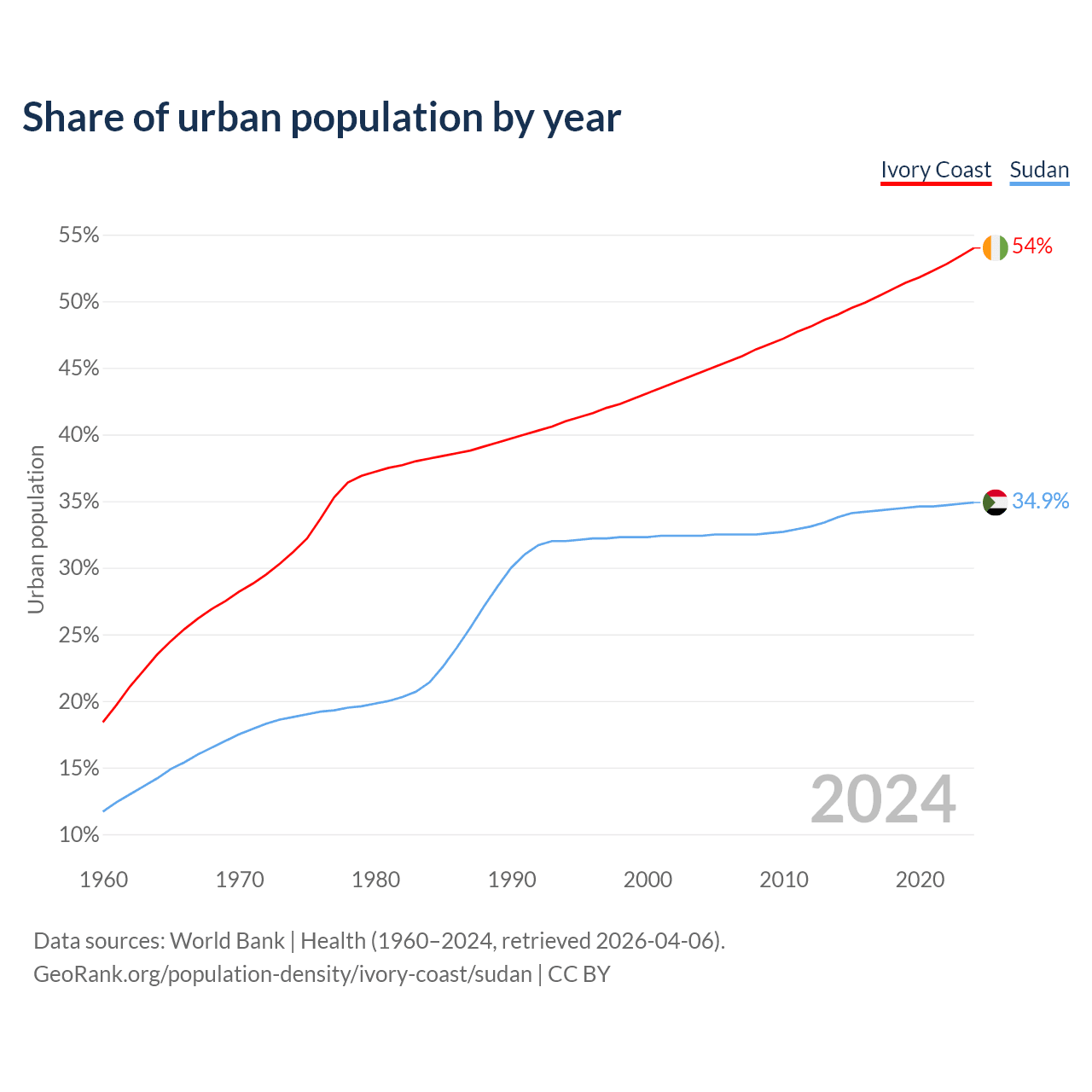 From 2004 to 2024, the share of urban population changed from 44.7% to 54% in Ivory Coast and from 32.4% to 34.9% in Sudan.