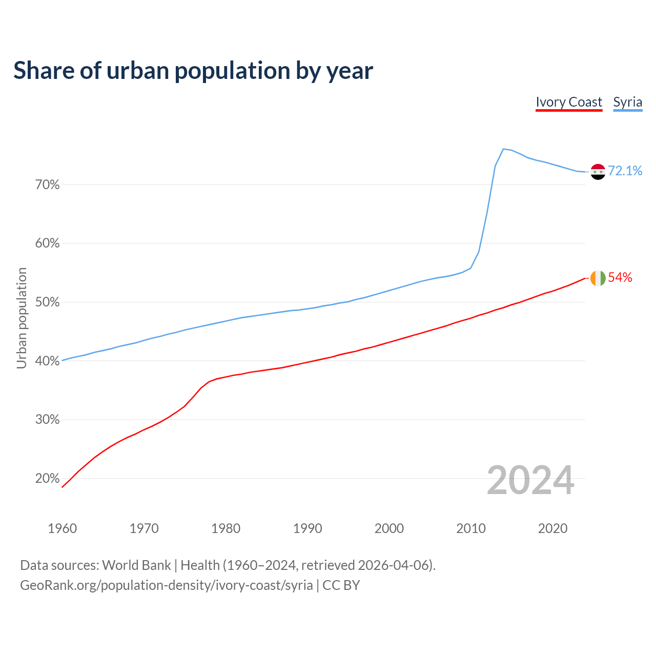 From 2004 to 2024, the share of urban population changed from 44.7% to 54% in Ivory Coast and from 53.5% to 72.1% in Syria.
