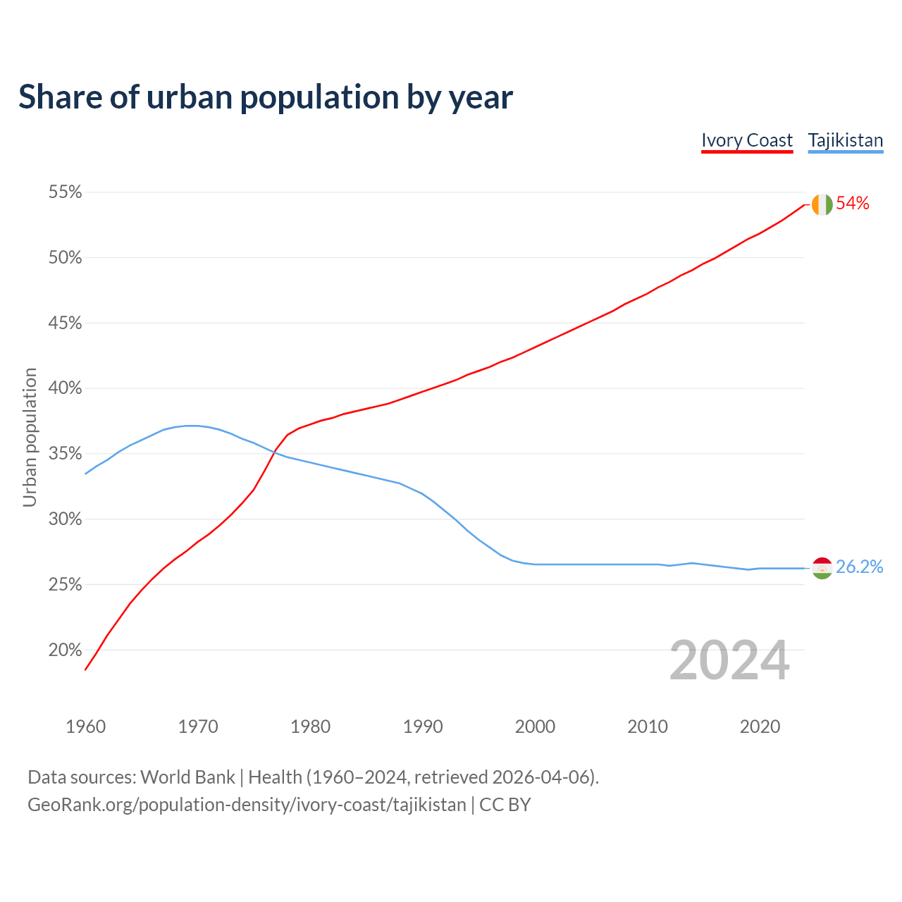 From 2004 to 2024, the share of urban population changed from 44.7% to 54% in Ivory Coast and from 26.5% to 26.2% in Tajikistan.