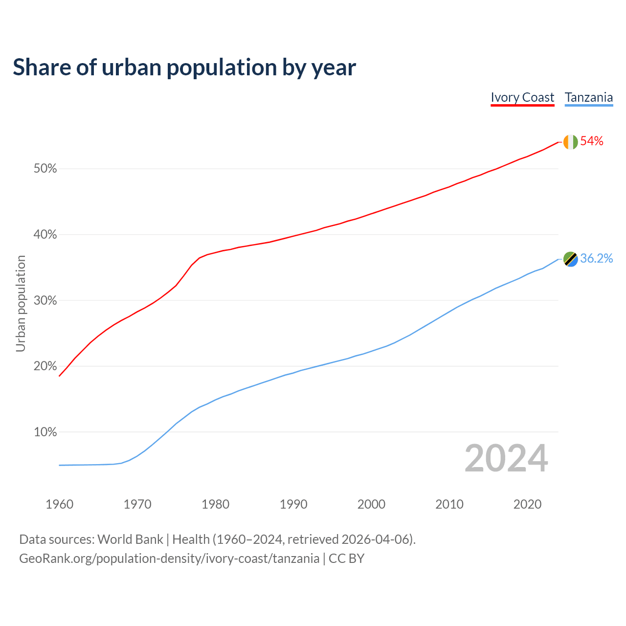 From 2004 to 2024, the share of urban population changed from 44.7% to 54% in Ivory Coast and from 24.1% to 36.2% in Tanzania.