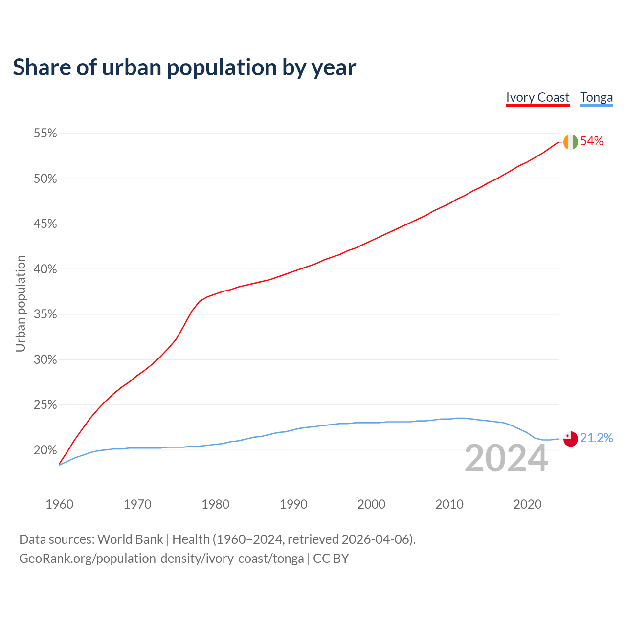 From 2004 to 2024, the share of urban population changed from 44.7% to 54% in Ivory Coast and from 23.1% to 21.2% in Tonga.