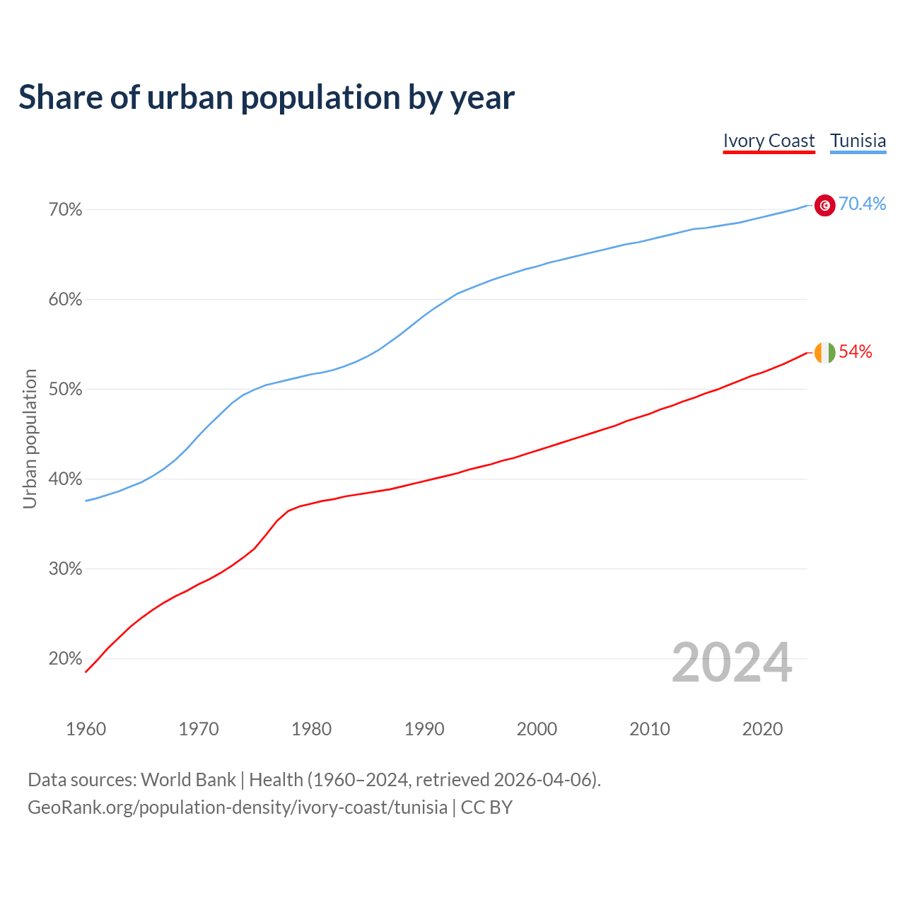 From 2004 to 2024, the share of urban population changed from 44.7% to 54% in Ivory Coast and from 64.9% to 70.4% in Tunisia.