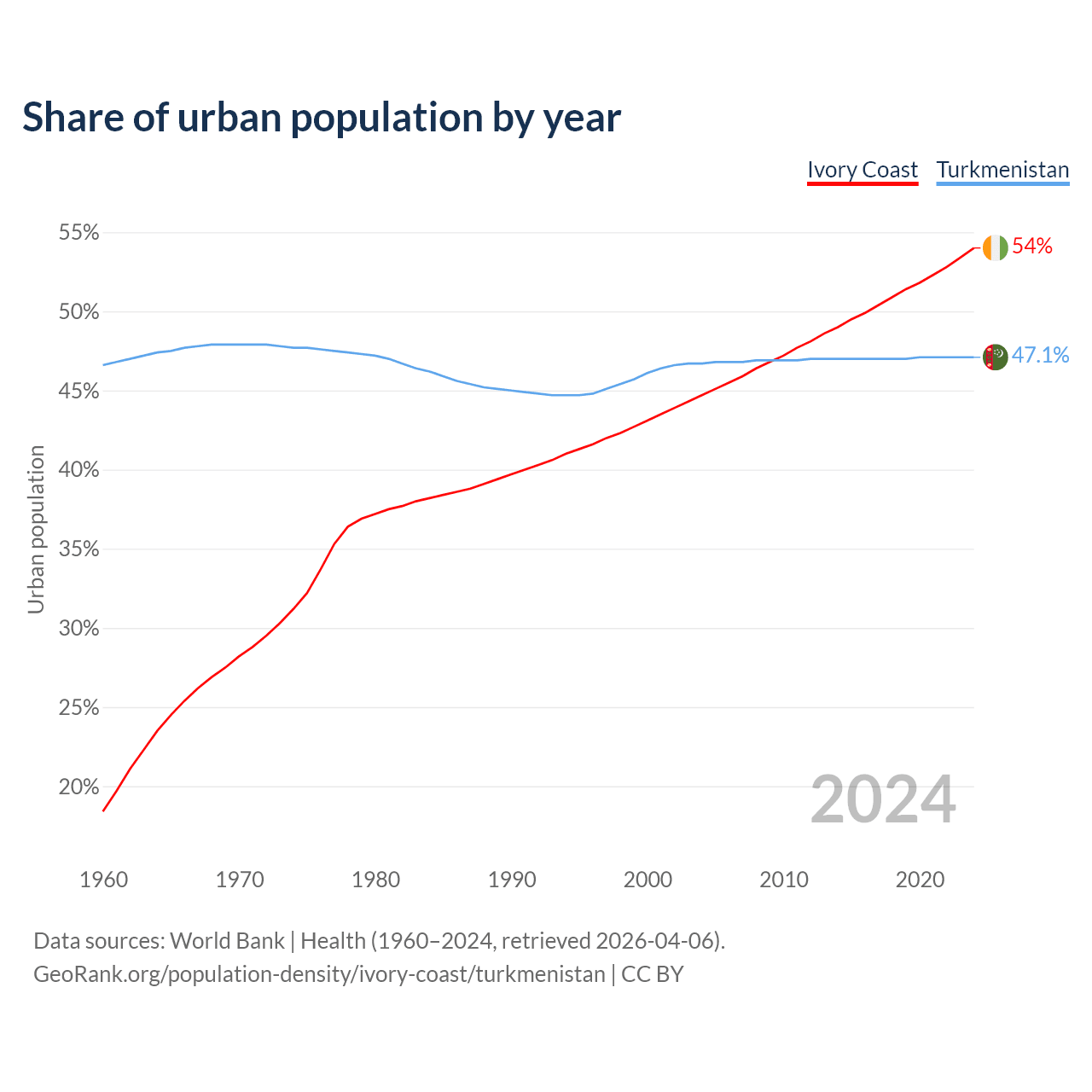 From 2004 to 2024, the share of urban population changed from 44.7% to 54% in Ivory Coast and from 46.7% to 47.1% in Turkmenistan.