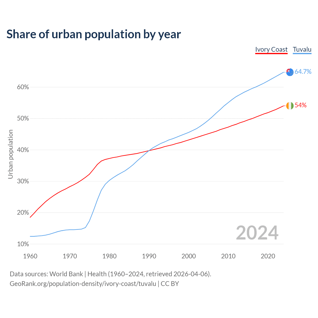 From 2004 to 2024, the share of urban population changed from 44.7% to 54% in Ivory Coast and from 48.4% to 64.7% in Tuvalu.
