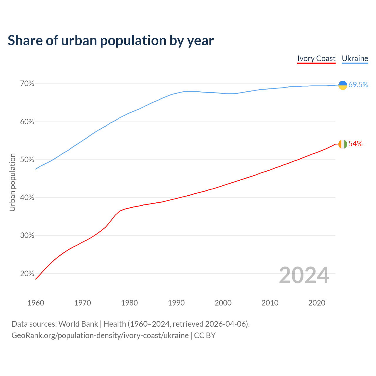 From 2004 to 2024, the share of urban population changed from 44.7% to 54% in Ivory Coast and from 67.6% to 69.5% in Ukraine.