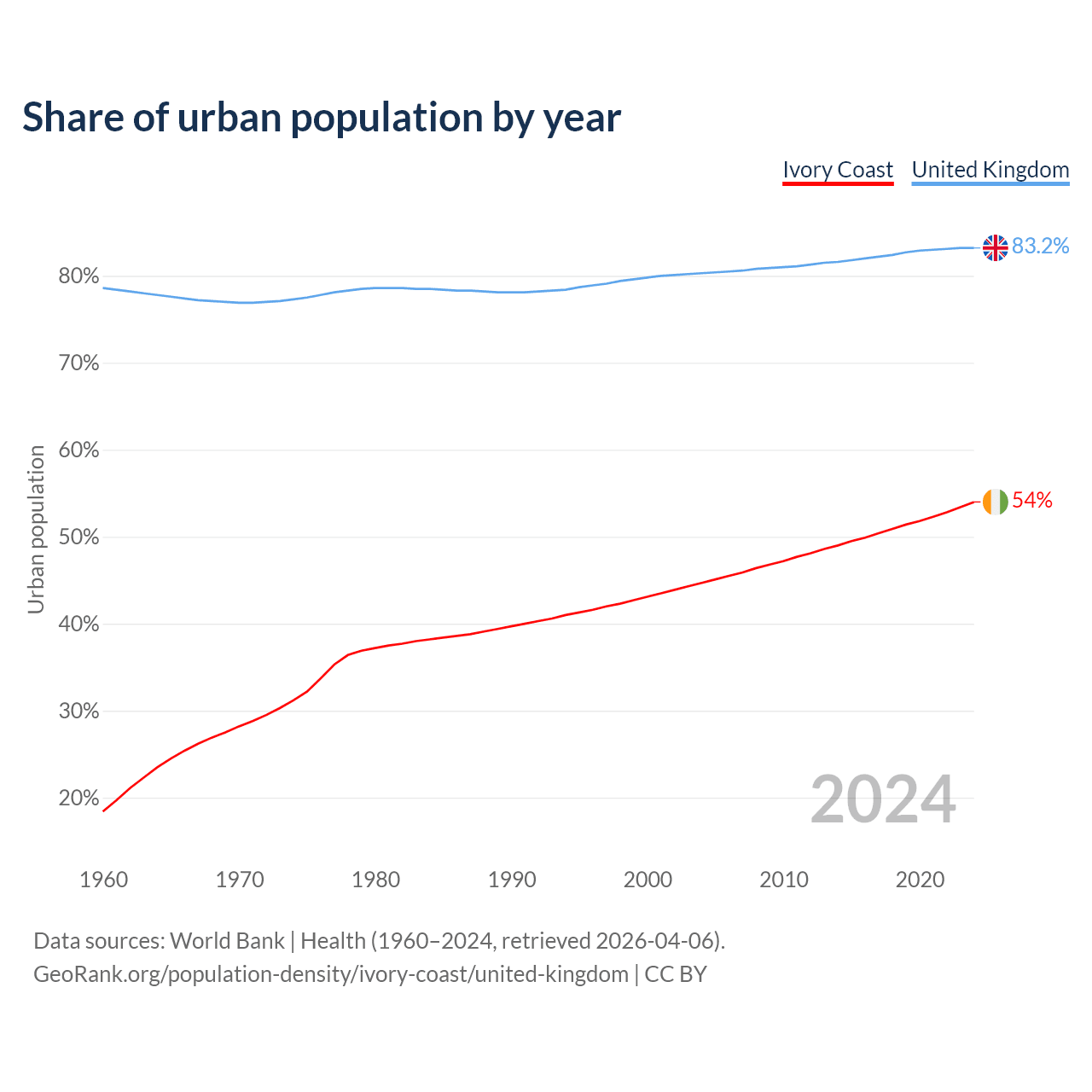 From 2004 to 2024, the share of urban population changed from 44.7% to 54% in Ivory Coast and from 80.3% to 83.2% in the United Kingdom.