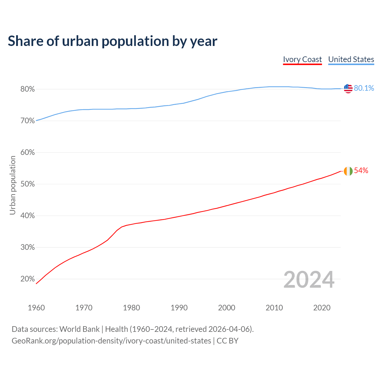 From 2004 to 2024, the share of urban population changed from 44.7% to 54% in Ivory Coast and from 80% to 80.1% in the United States.