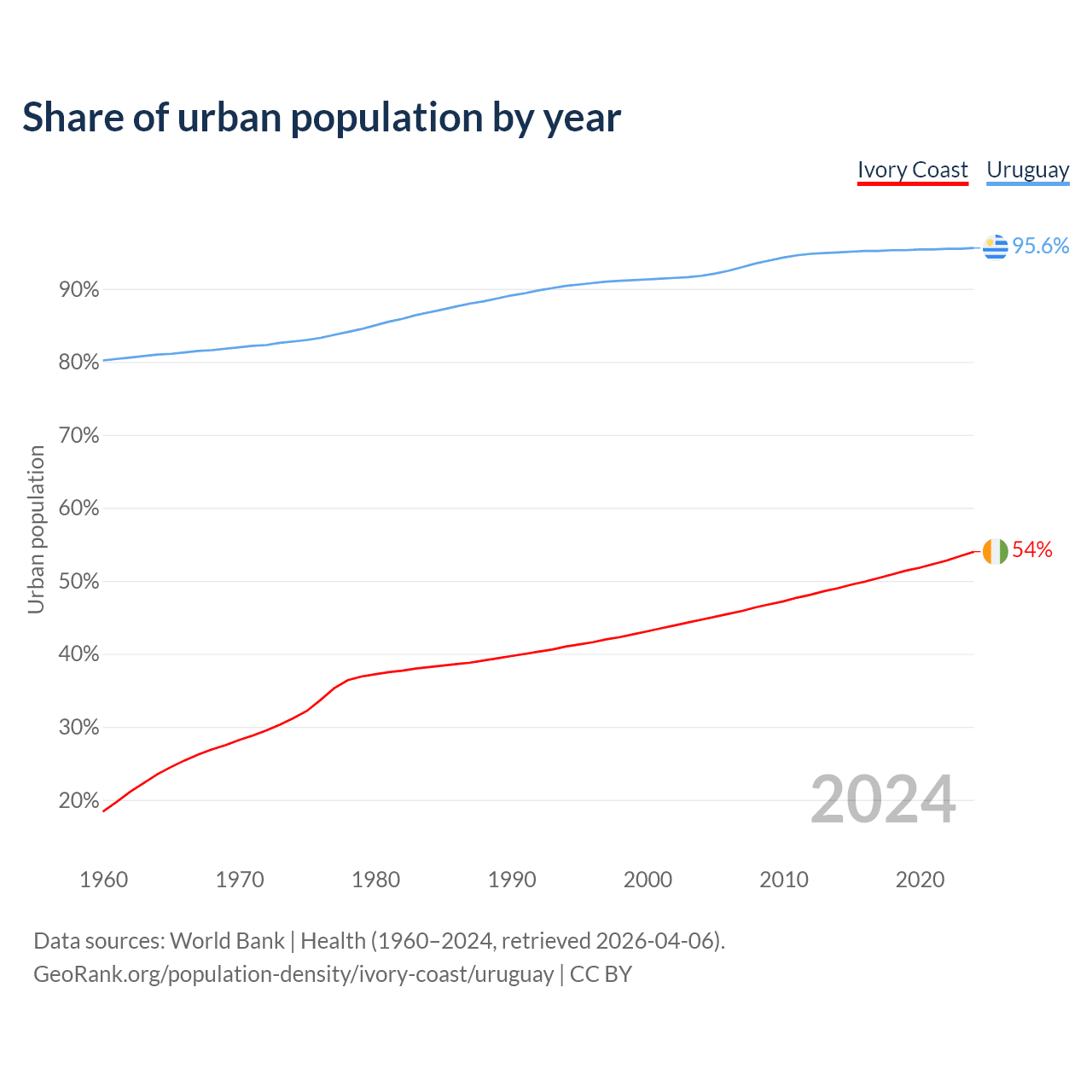 From 2004 to 2024, the share of urban population changed from 44.7% to 54% in Ivory Coast and from 91.8% to 95.6% in Uruguay.