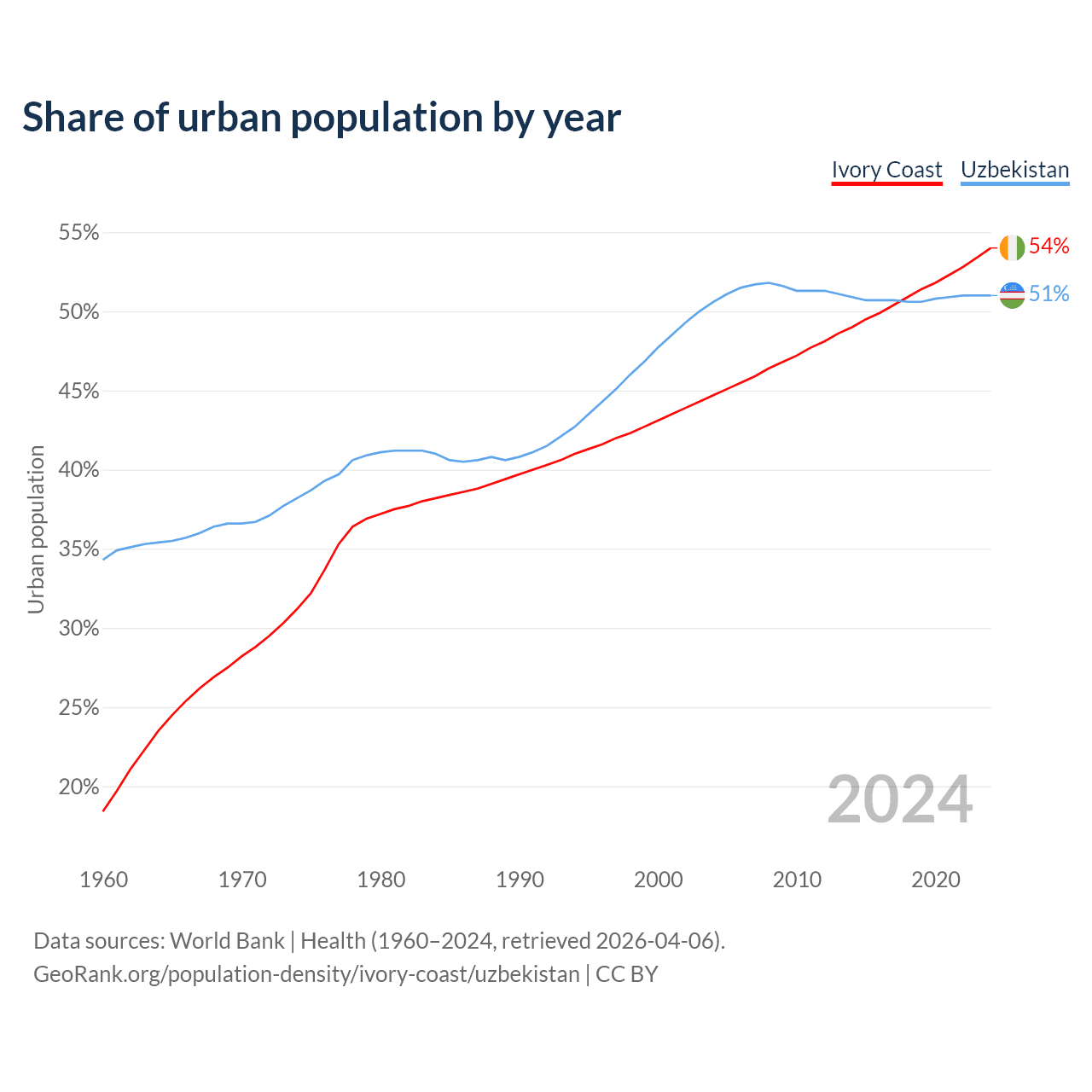 From 2004 to 2024, the share of urban population changed from 44.7% to 54% in Ivory Coast and from 50.6% to 51% in Uzbekistan.