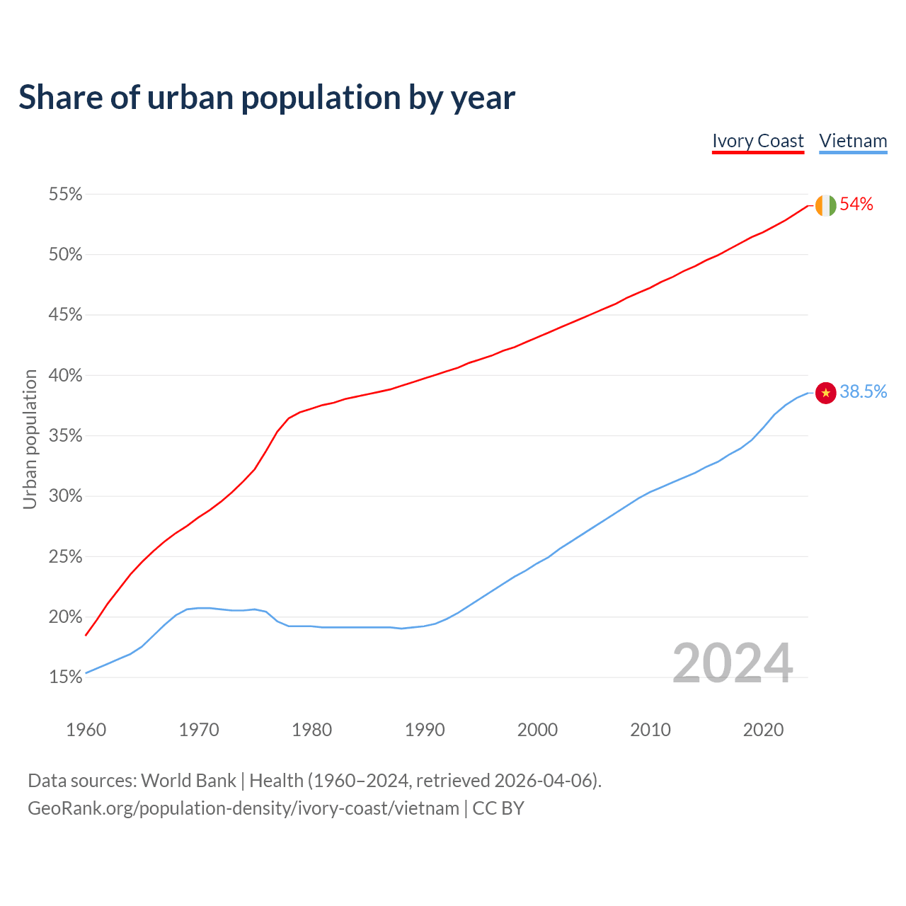 From 2004 to 2024, the share of urban population changed from 44.7% to 54% in Ivory Coast and from 26.8% to 38.5% in Vietnam.