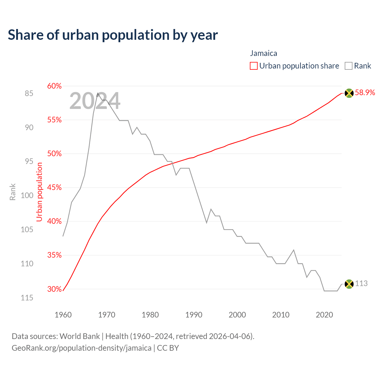 This chart shows the share of urban population in Jamaica from 1960 to 2024: 29.7% lived in urban areas in 1960, 51.7% in 2000, and 58.9% in 2024.