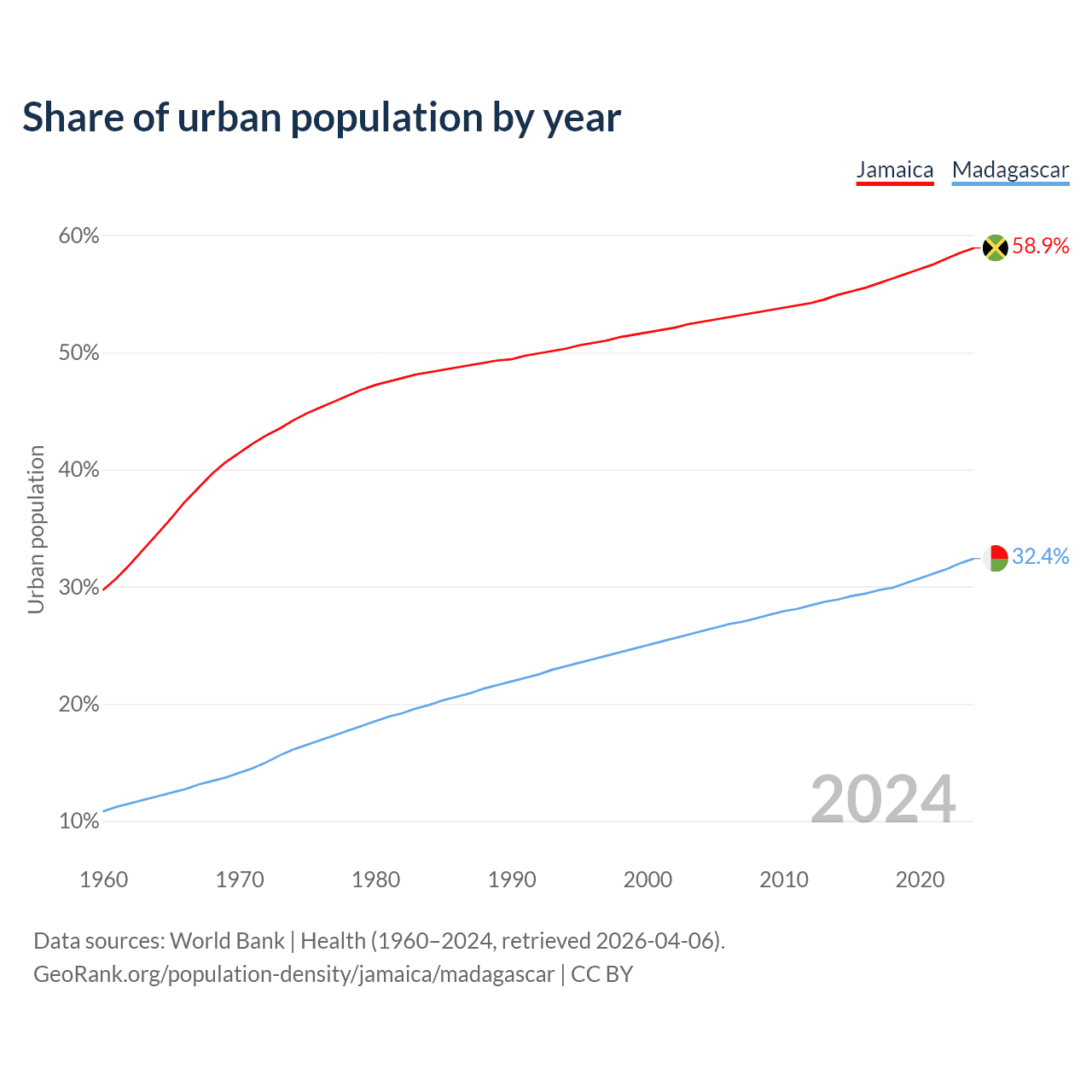 From 2004 to 2024, the share of urban population changed from 52.6% to 58.9% in Jamaica and from 26.2% to 32.4% in Madagascar.