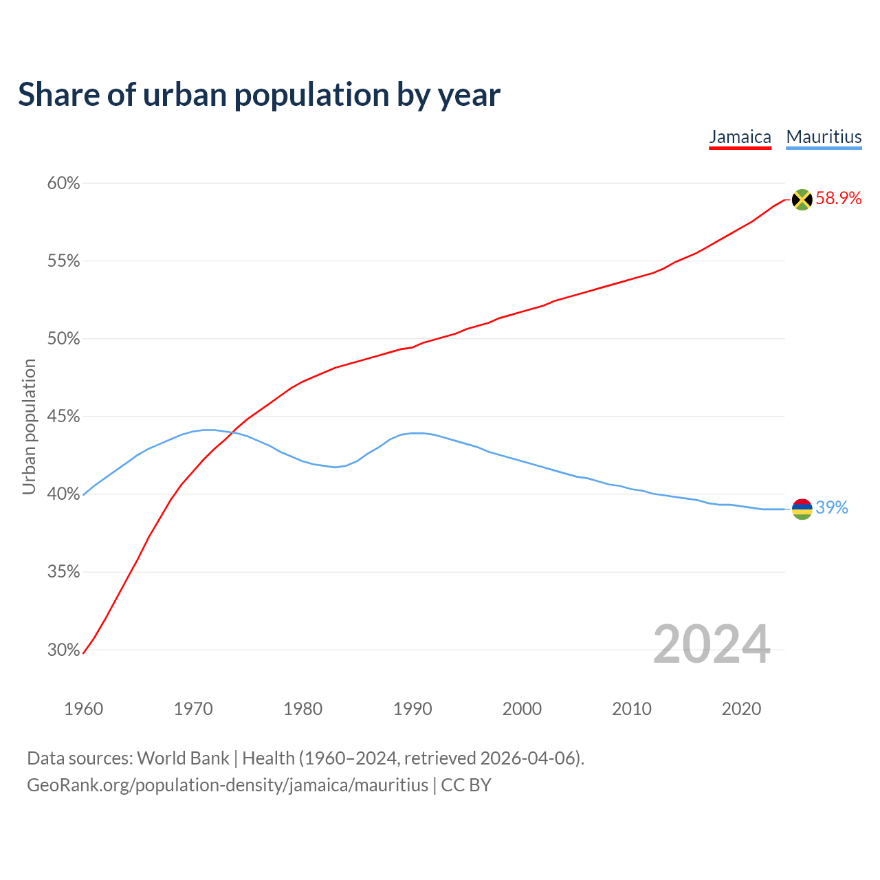 From 2004 to 2024, the share of urban population changed from 52.6% to 58.9% in Jamaica and from 41.3% to 39% in Mauritius.