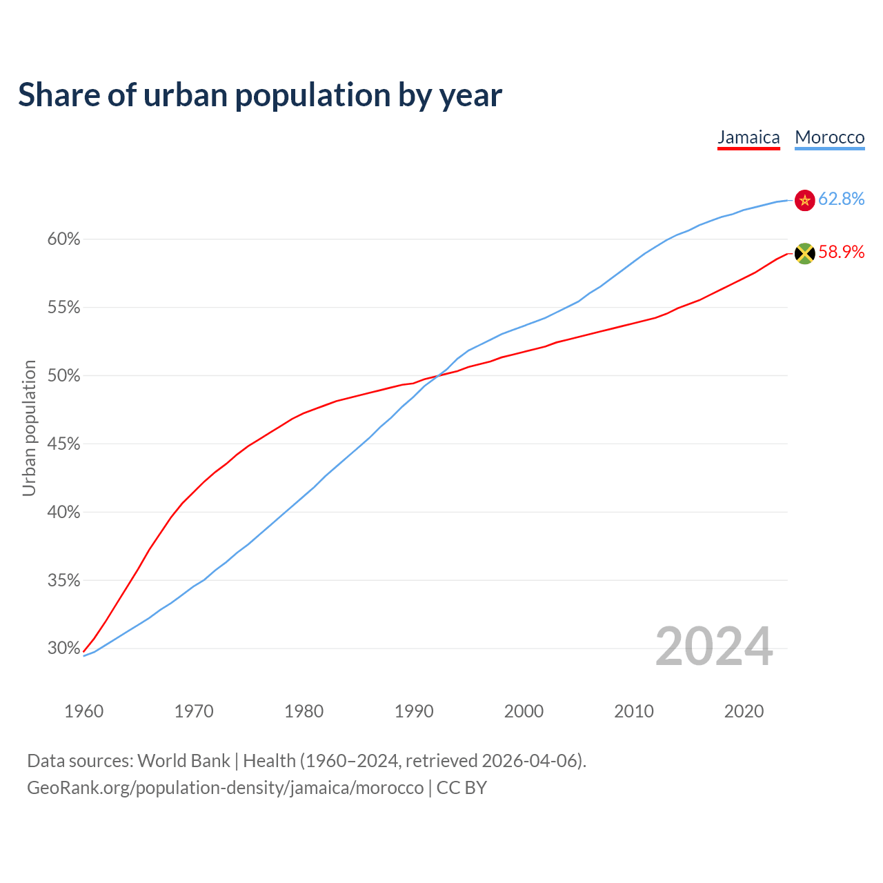 From 2004 to 2024, the share of urban population changed from 52.6% to 58.9% in Jamaica and from 55% to 62.8% in Morocco.