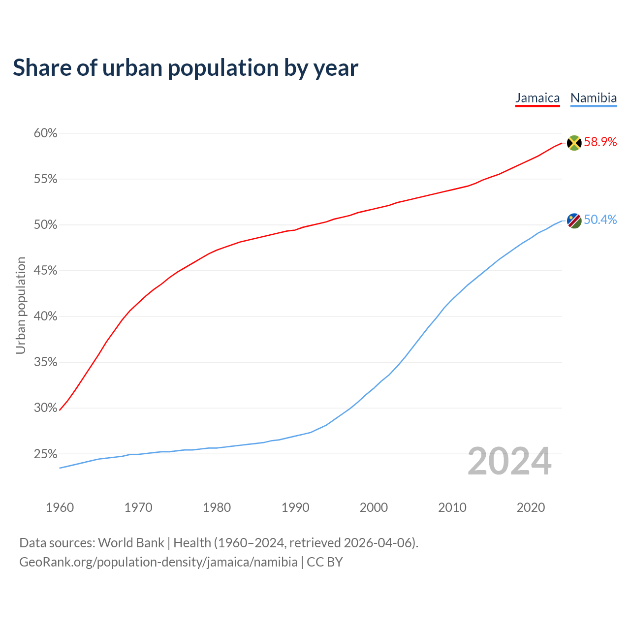 From 2004 to 2024, the share of urban population changed from 52.6% to 58.9% in Jamaica and from 35.5% to 50.4% in Namibia.