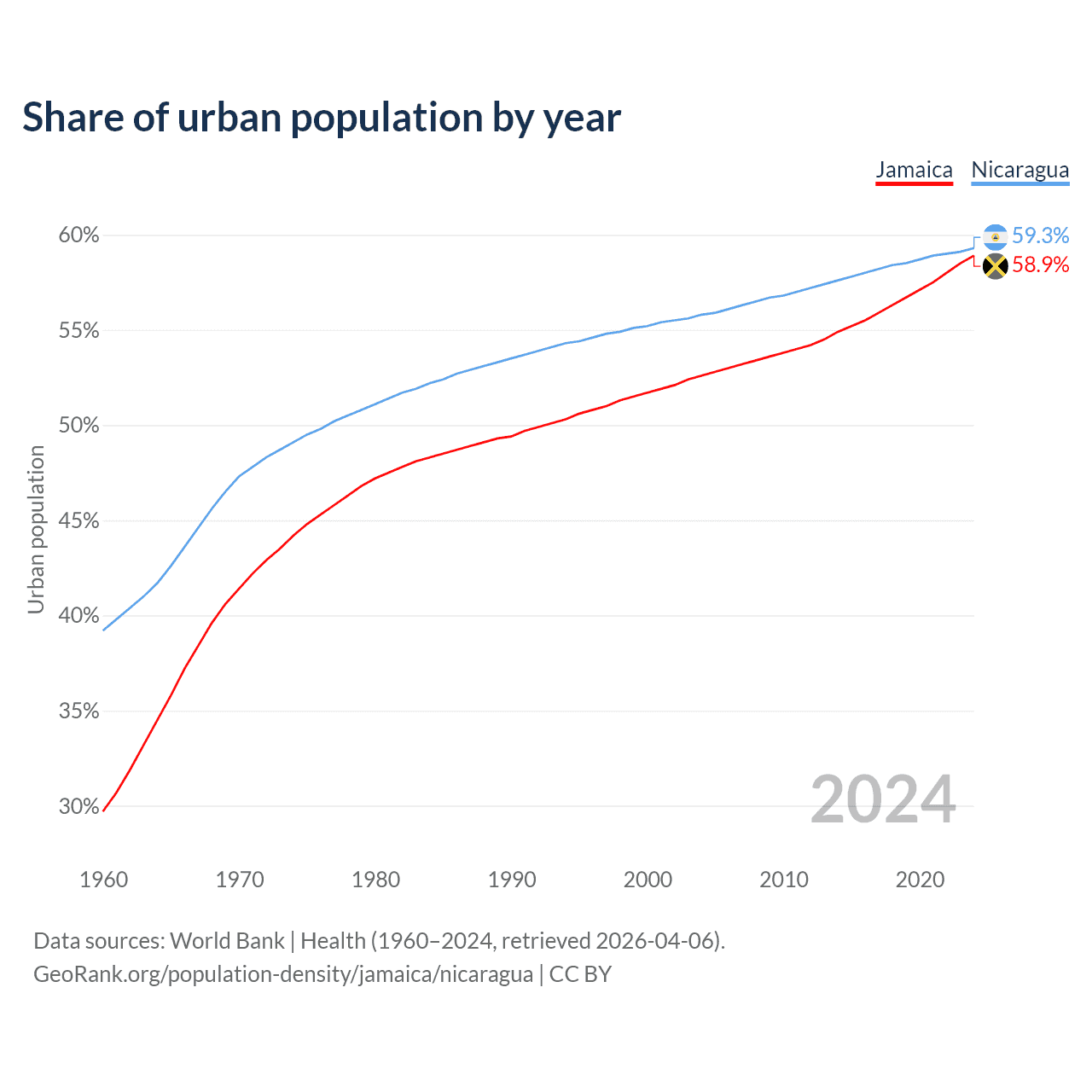 From 2004 to 2024, the share of urban population changed from 52.6% to 58.9% in Jamaica and from 55.8% to 59.3% in Nicaragua.