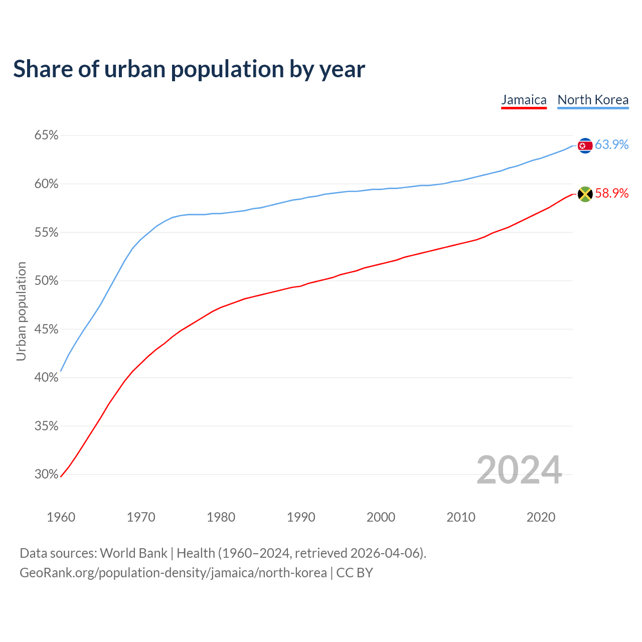 From 2004 to 2024, the share of urban population changed from 52.6% to 58.9% in Jamaica and from 59.7% to 63.9% in North Korea.