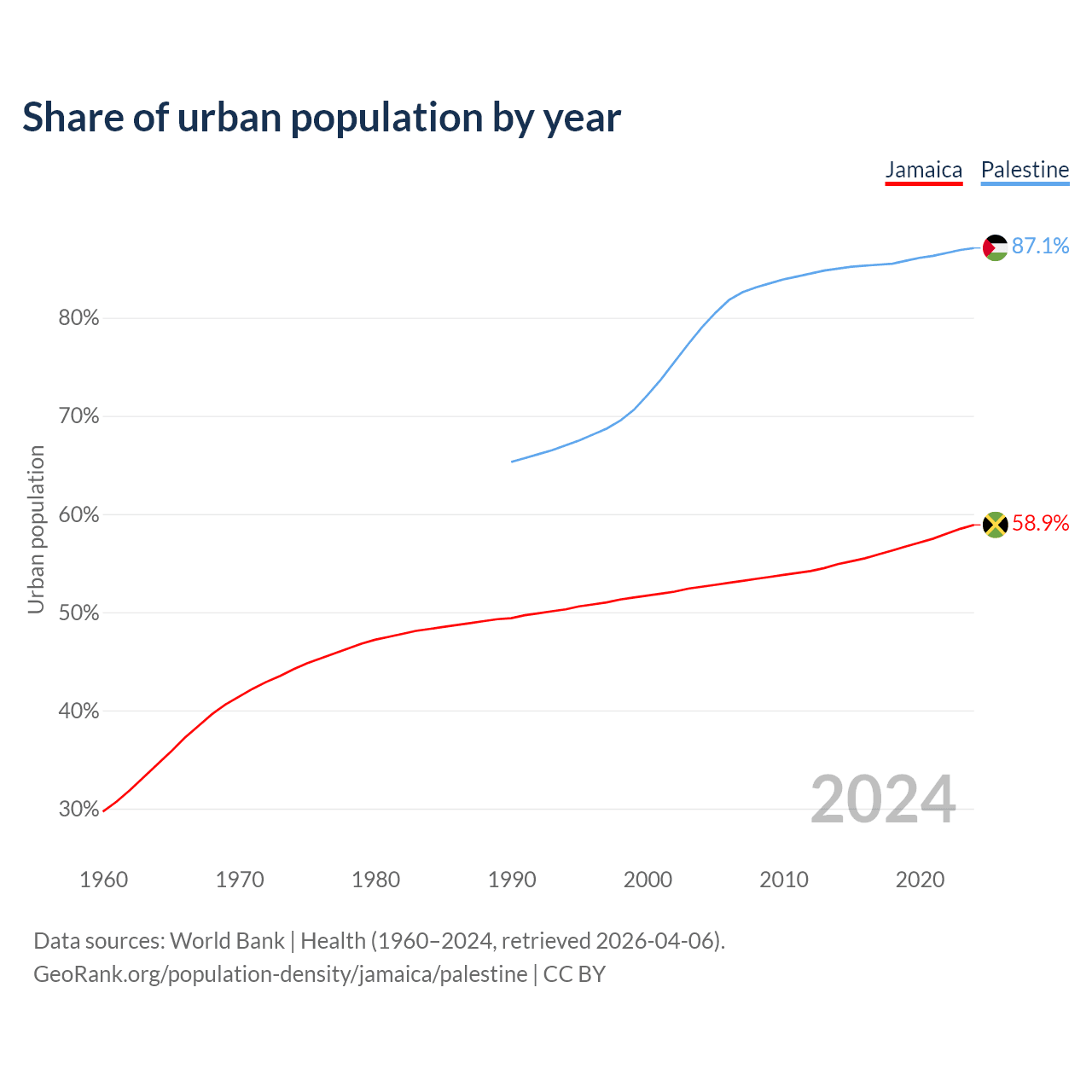 From 2004 to 2024, the share of urban population changed from 52.6% to 58.9% in Jamaica and from 79% to 87.1% in Palestine.