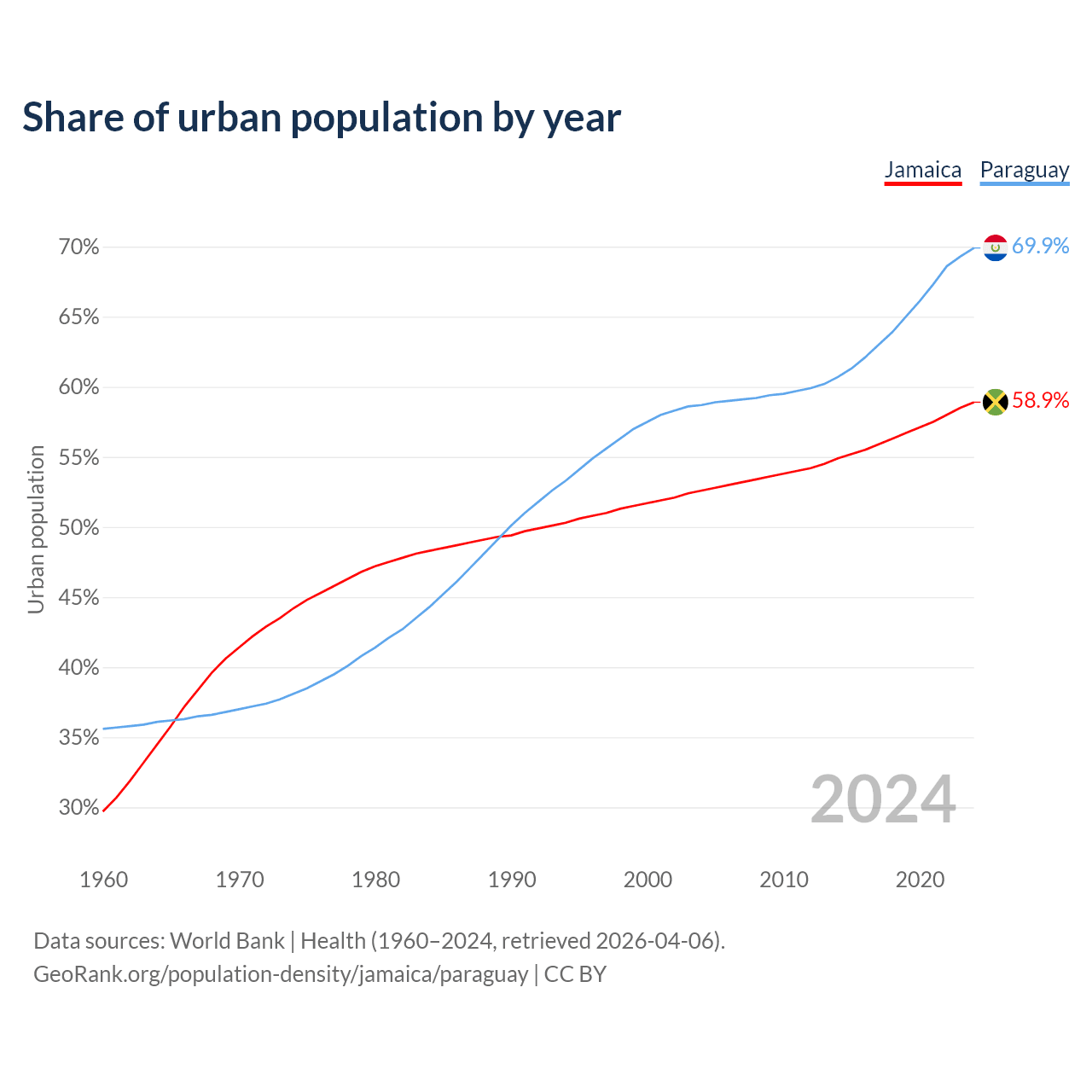 From 2004 to 2024, the share of urban population changed from 52.6% to 58.9% in Jamaica and from 58.7% to 69.9% in Paraguay.