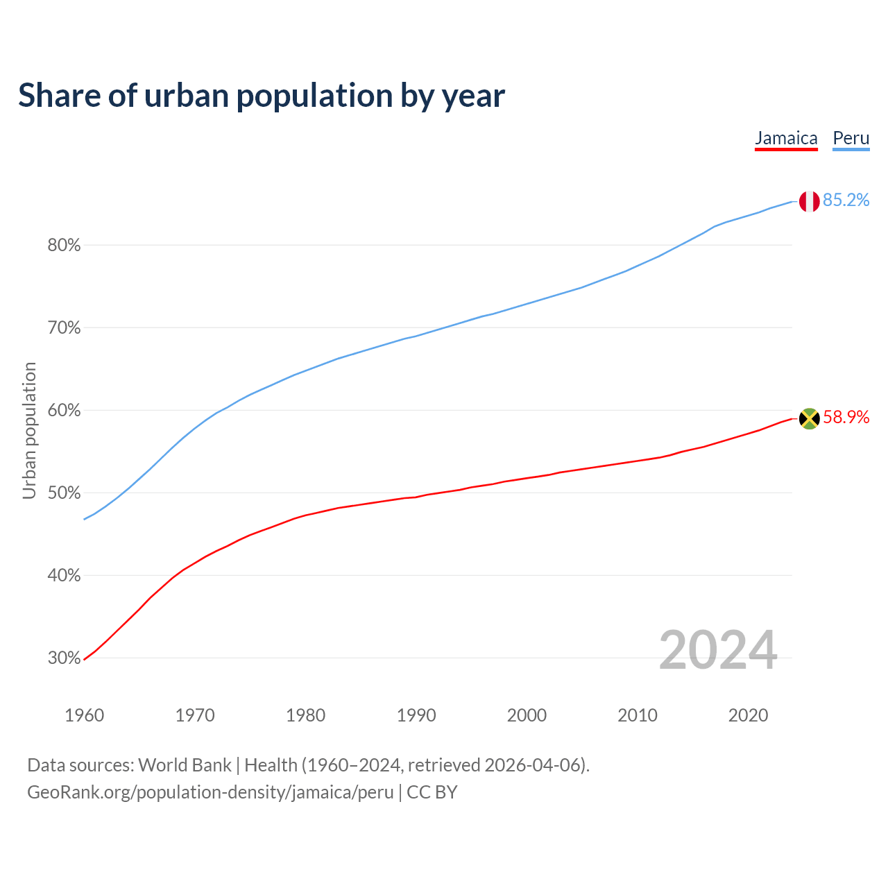 From 2004 to 2024, the share of urban population changed from 52.6% to 58.9% in Jamaica and from 74.4% to 85.2% in Peru.