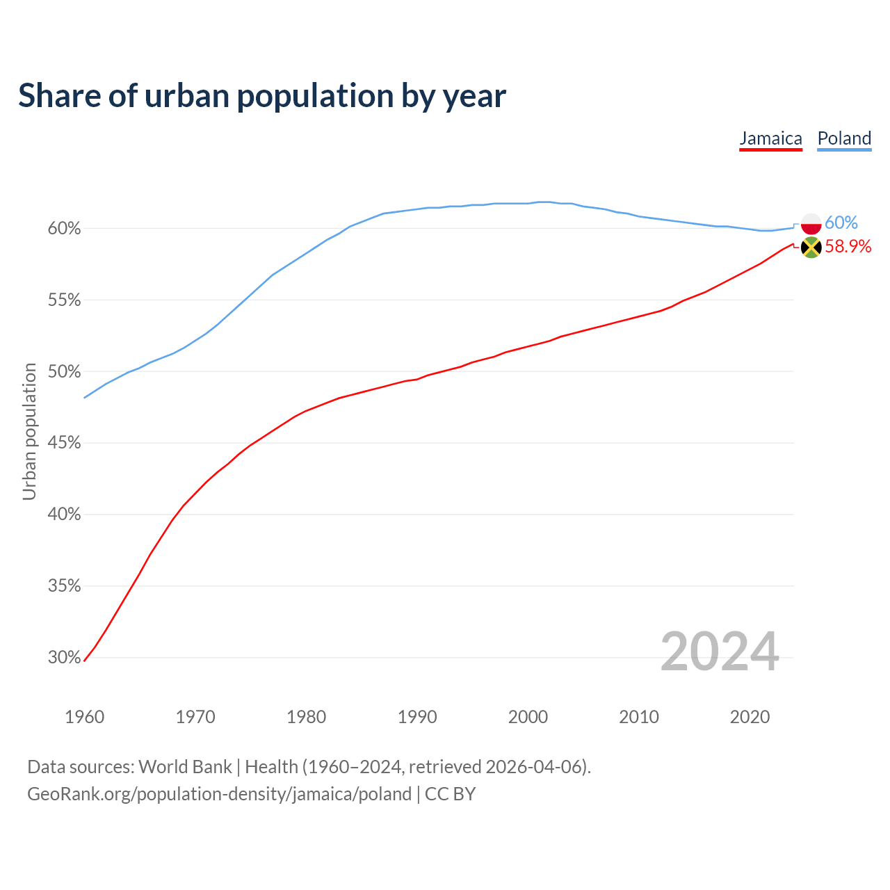From 2004 to 2024, the share of urban population changed from 52.6% to 58.9% in Jamaica and from 61.7% to 60% in Poland.