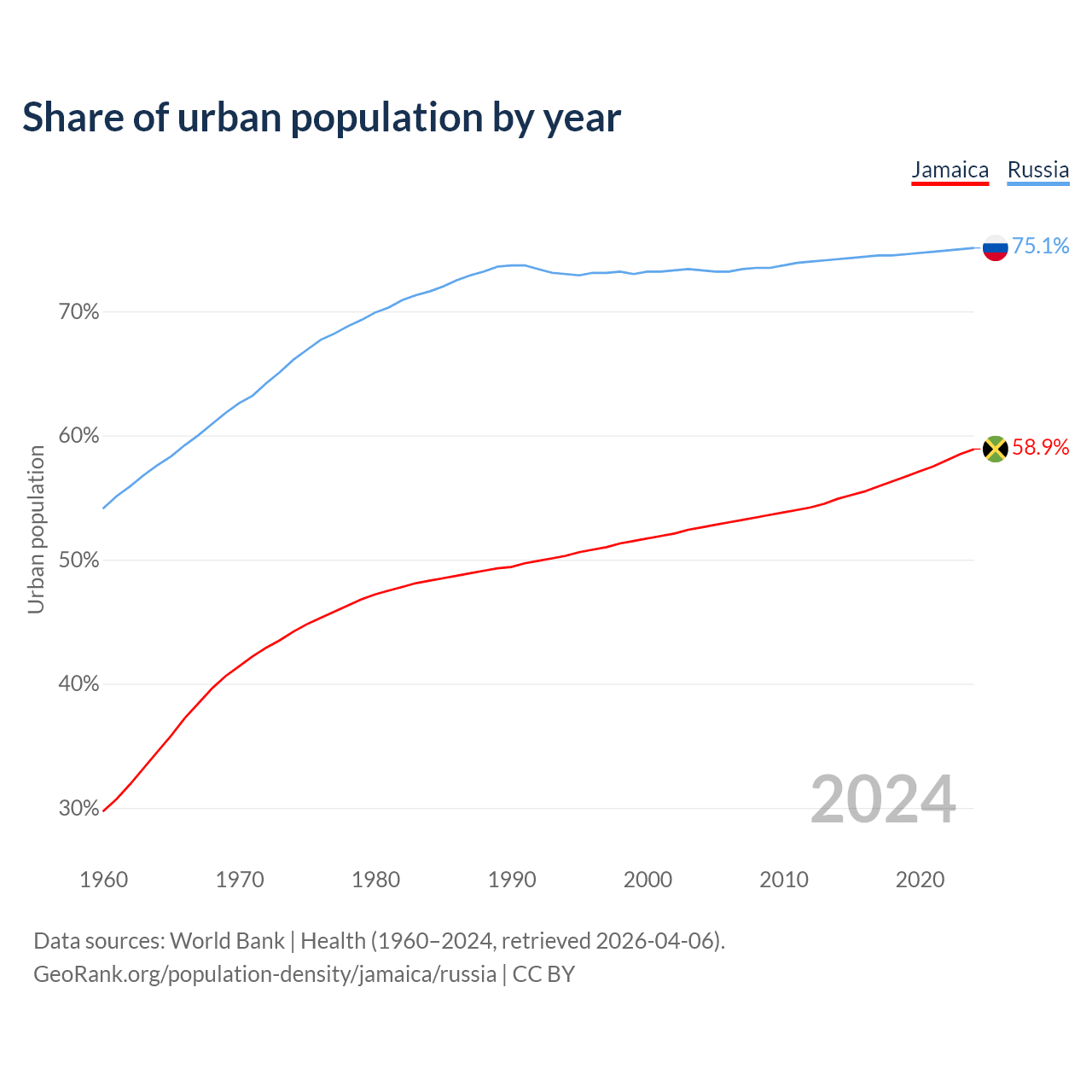 From 2004 to 2024, the share of urban population changed from 52.6% to 58.9% in Jamaica and from 73.3% to 75.1% in Russia.