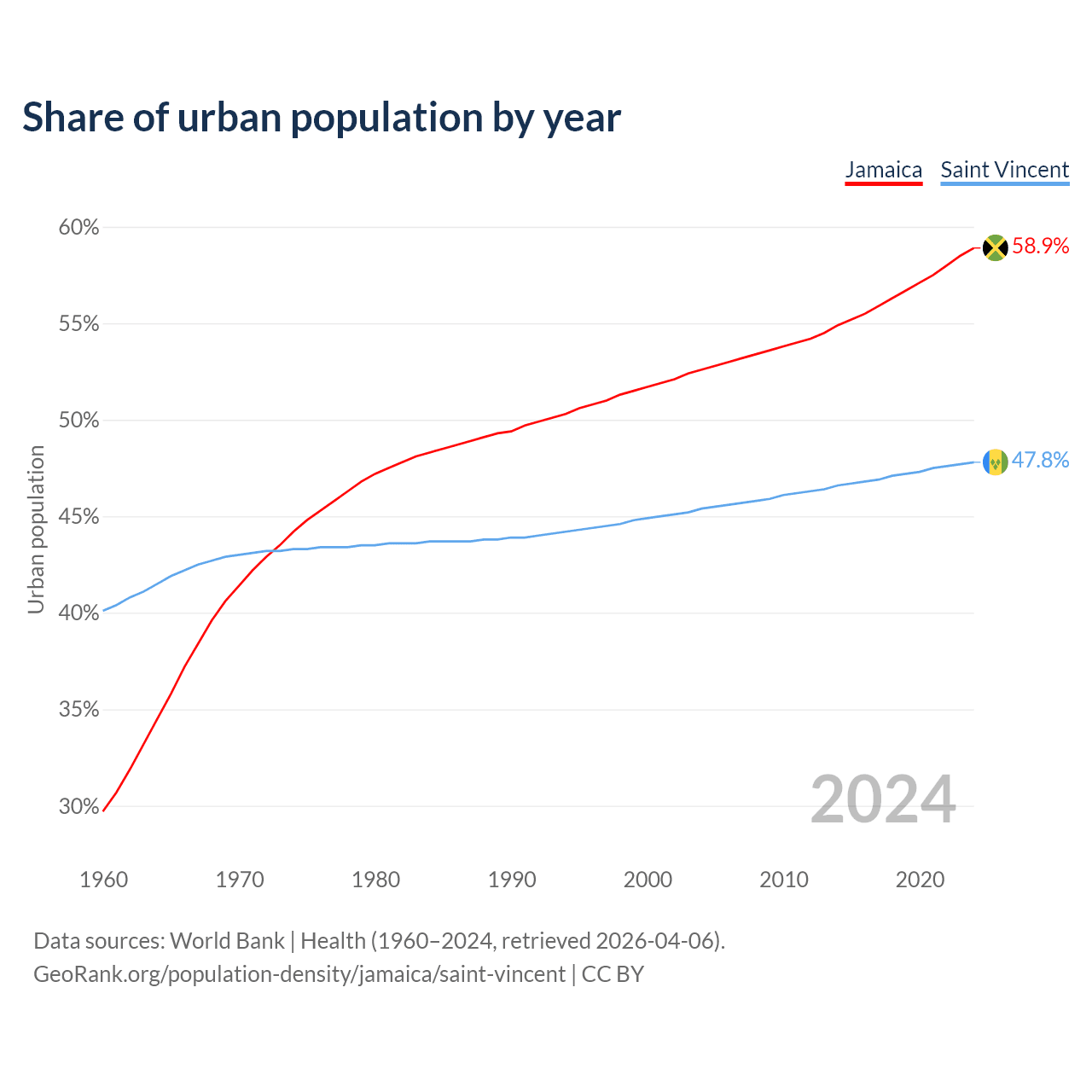 From 2004 to 2024, the share of urban population changed from 52.6% to 58.9% in Jamaica and from 45.4% to 47.8% in Saint Vincent.