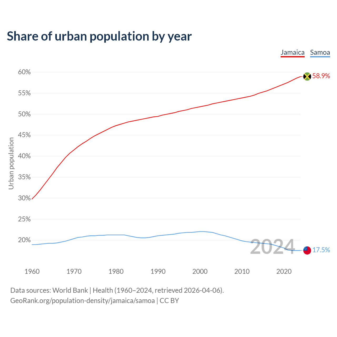 From 2004 to 2024, the share of urban population changed from 52.6% to 58.9% in Jamaica and from 21.5% to 17.5% in Samoa.