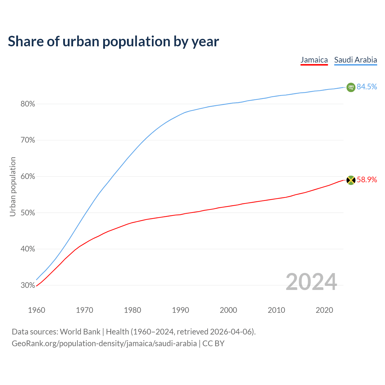 From 2004 to 2024, the share of urban population changed from 52.6% to 58.9% in Jamaica and from 80.8% to 84.5% in Saudi Arabia.