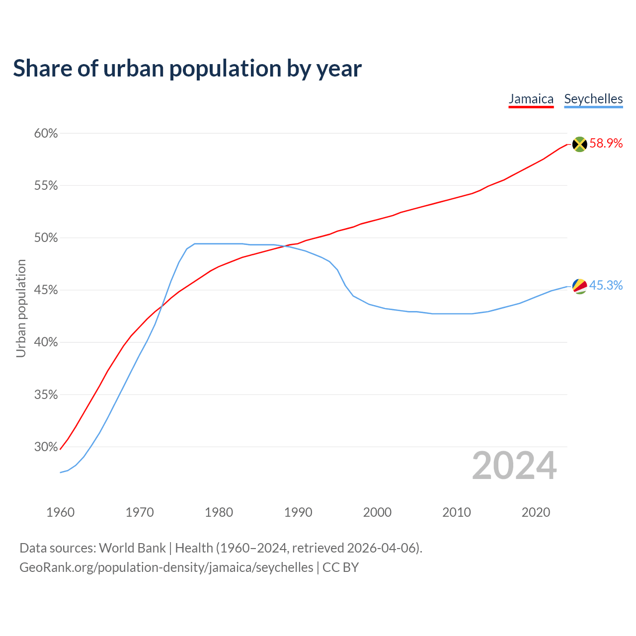 From 2004 to 2024, the share of urban population changed from 52.6% to 58.9% in Jamaica and from 42.9% to 45.3% in the Seychelles.