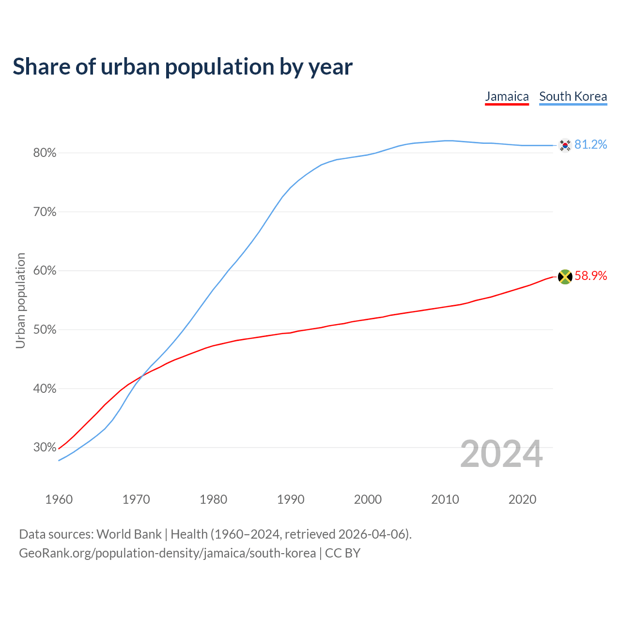 From 2004 to 2024, the share of urban population changed from 52.6% to 58.9% in Jamaica and from 81.1% to 81.2% in South Korea.