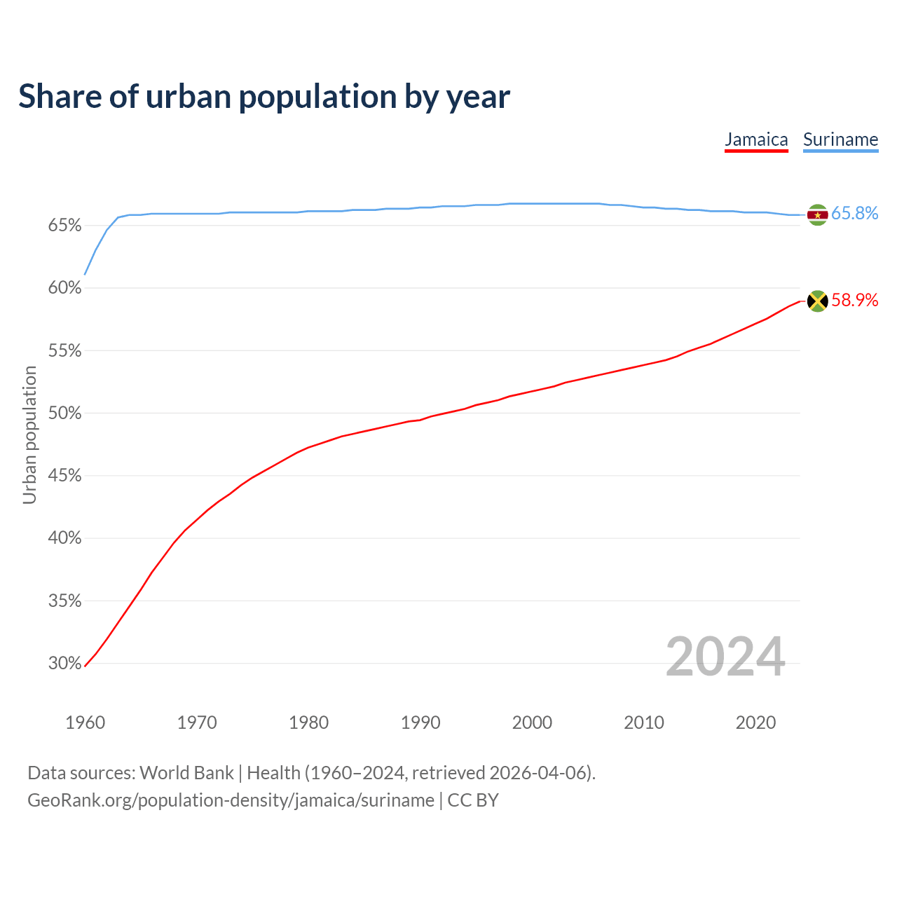 From 2004 to 2024, the share of urban population changed from 52.6% to 58.9% in Jamaica and from 66.7% to 65.8% in Suriname.