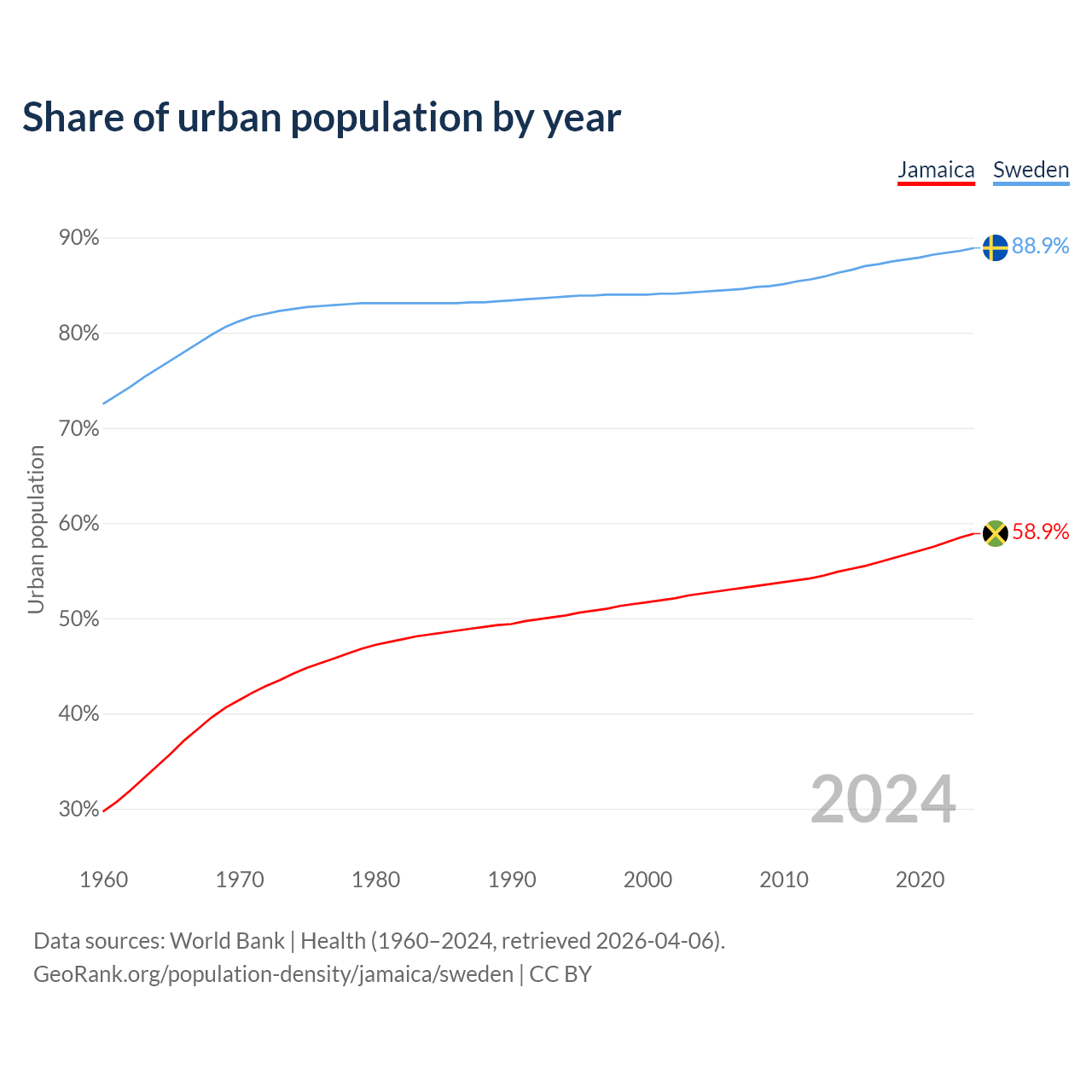 From 2004 to 2024, the share of urban population changed from 52.6% to 58.9% in Jamaica and from 84.3% to 88.9% in Sweden.