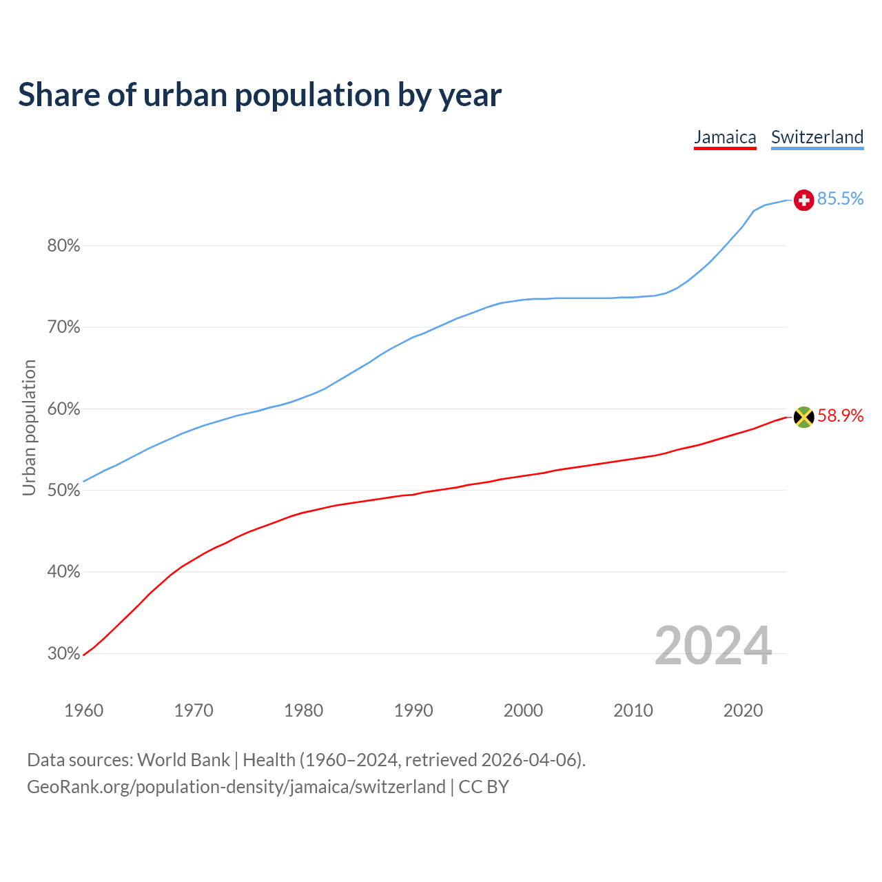 From 2004 to 2024, the share of urban population changed from 52.6% to 58.9% in Jamaica and from 73.5% to 85.5% in Switzerland.