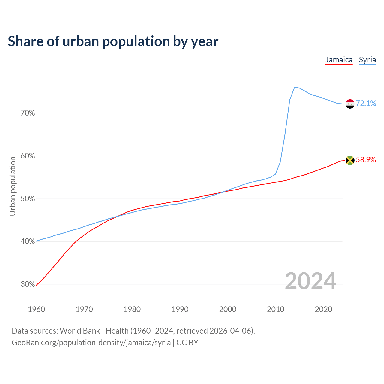 From 2004 to 2024, the share of urban population changed from 52.6% to 58.9% in Jamaica and from 53.5% to 72.1% in Syria.