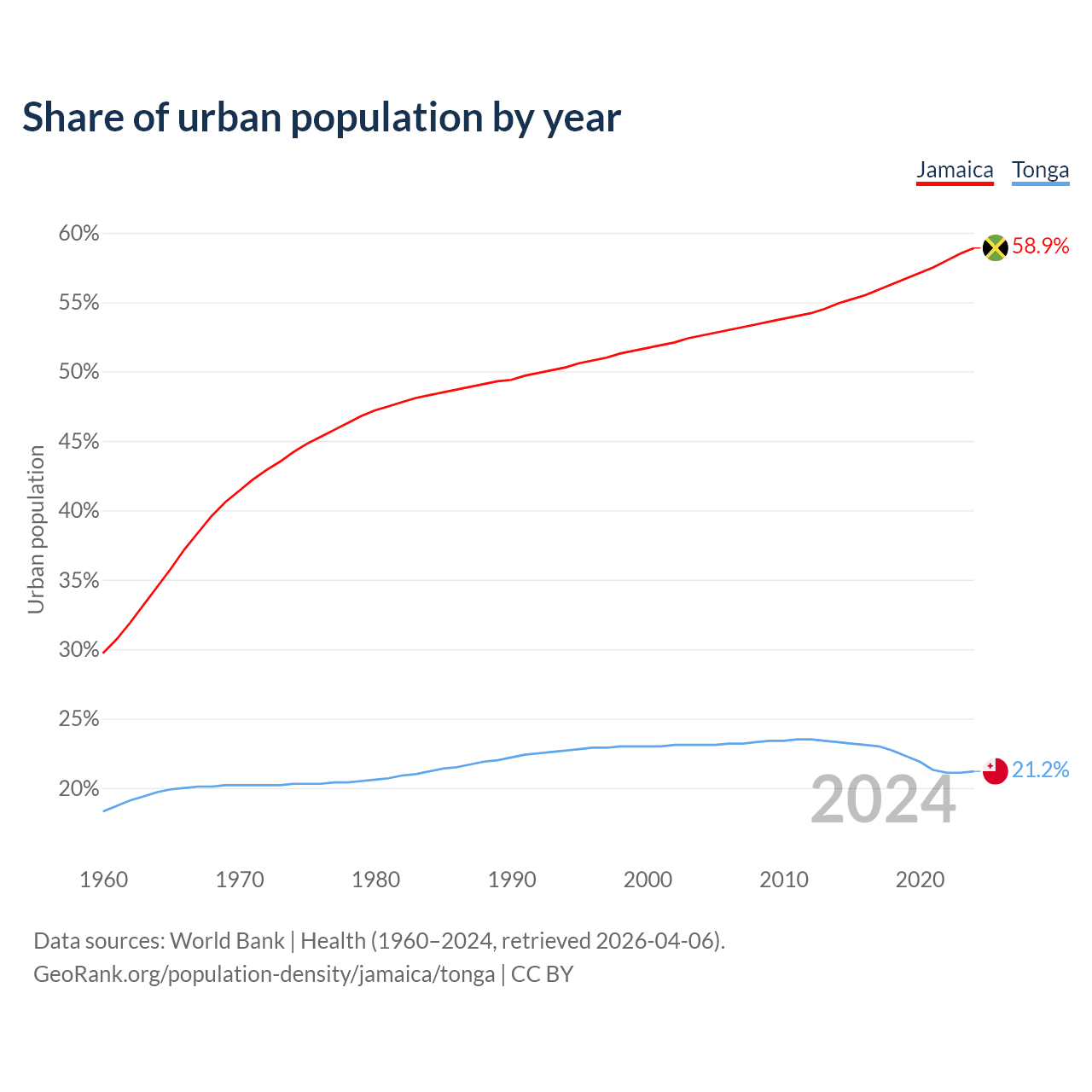 From 2004 to 2024, the share of urban population changed from 52.6% to 58.9% in Jamaica and from 23.1% to 21.2% in Tonga.