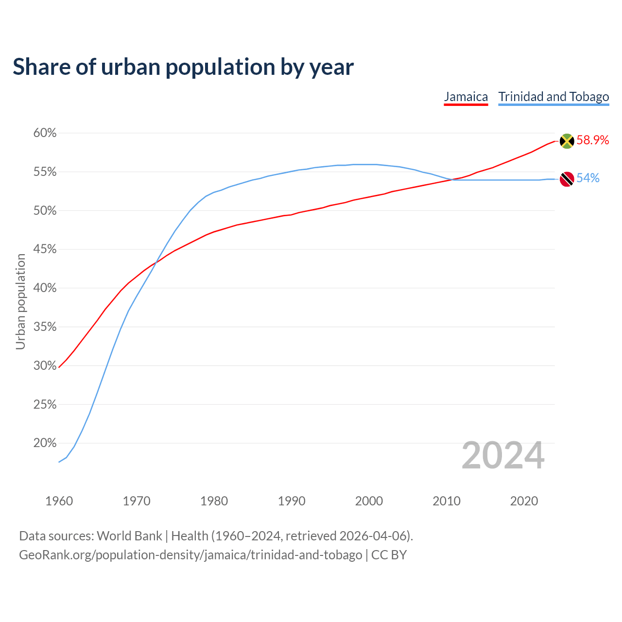 From 2004 to 2024, the share of urban population changed from 52.6% to 58.9% in Jamaica and from 55.6% to 54% in Trinidad and Tobago.