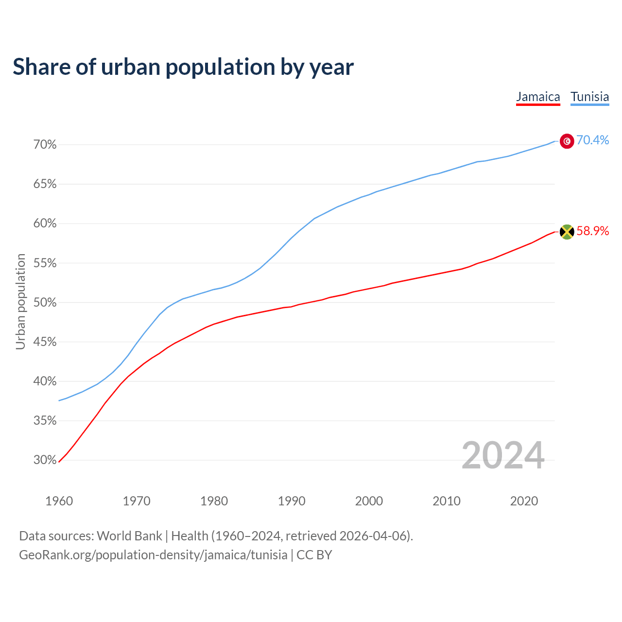 From 2004 to 2024, the share of urban population changed from 52.6% to 58.9% in Jamaica and from 64.9% to 70.4% in Tunisia.