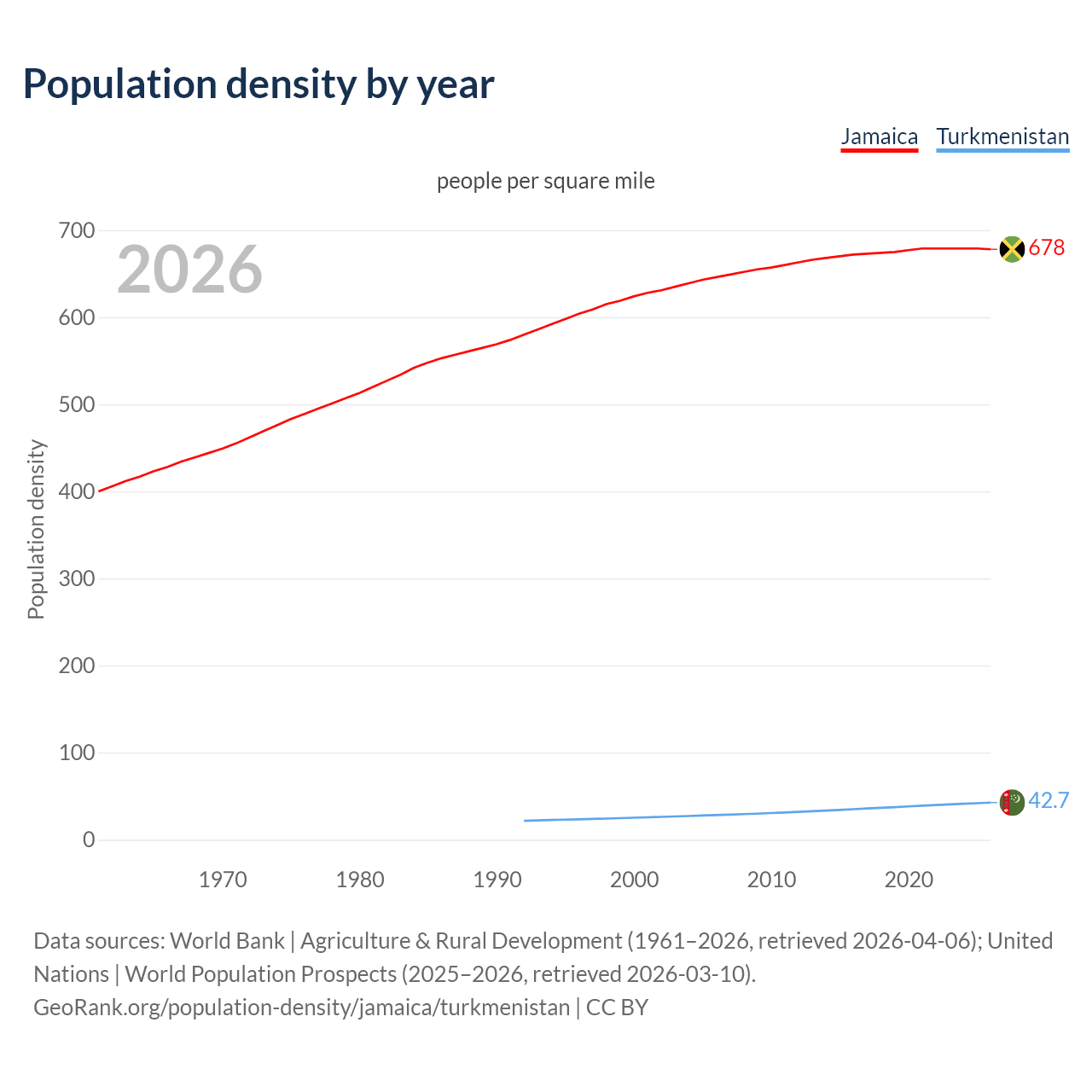 From 2006 to 2026, population density in Jamaica increased by 4.96%, compared to a 50.5% growth in Turkmenistan.