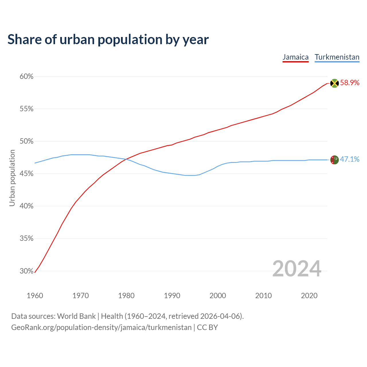 From 2004 to 2024, the share of urban population changed from 52.6% to 58.9% in Jamaica and from 46.7% to 47.1% in Turkmenistan.