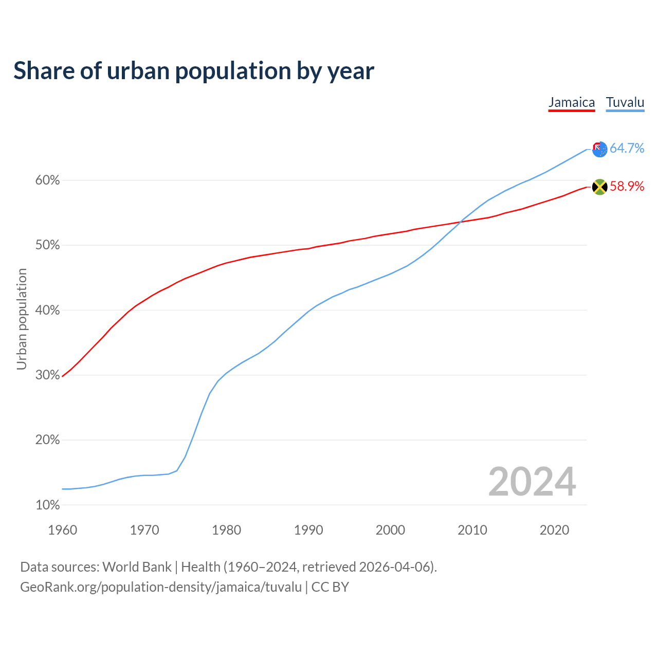 From 2004 to 2024, the share of urban population changed from 52.6% to 58.9% in Jamaica and from 48.4% to 64.7% in Tuvalu.