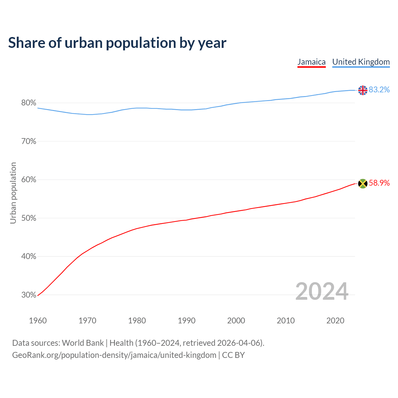 From 2004 to 2024, the share of urban population changed from 52.6% to 58.9% in Jamaica and from 80.3% to 83.2% in the United Kingdom.