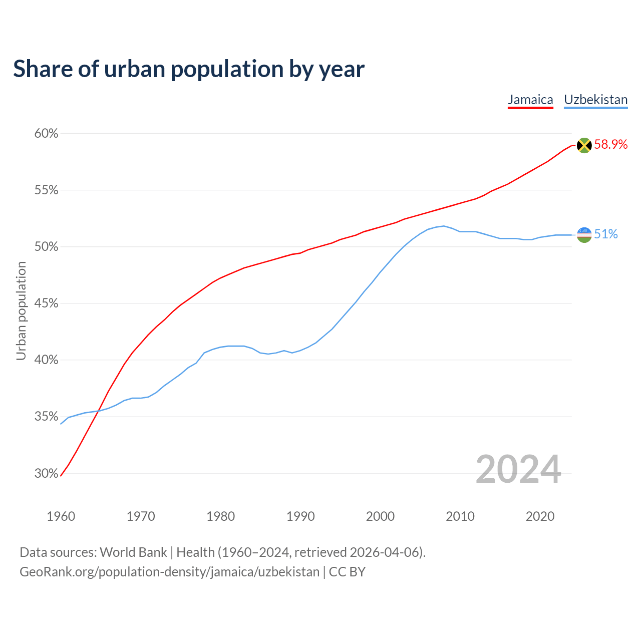 From 2004 to 2024, the share of urban population changed from 52.6% to 58.9% in Jamaica and from 50.6% to 51% in Uzbekistan.