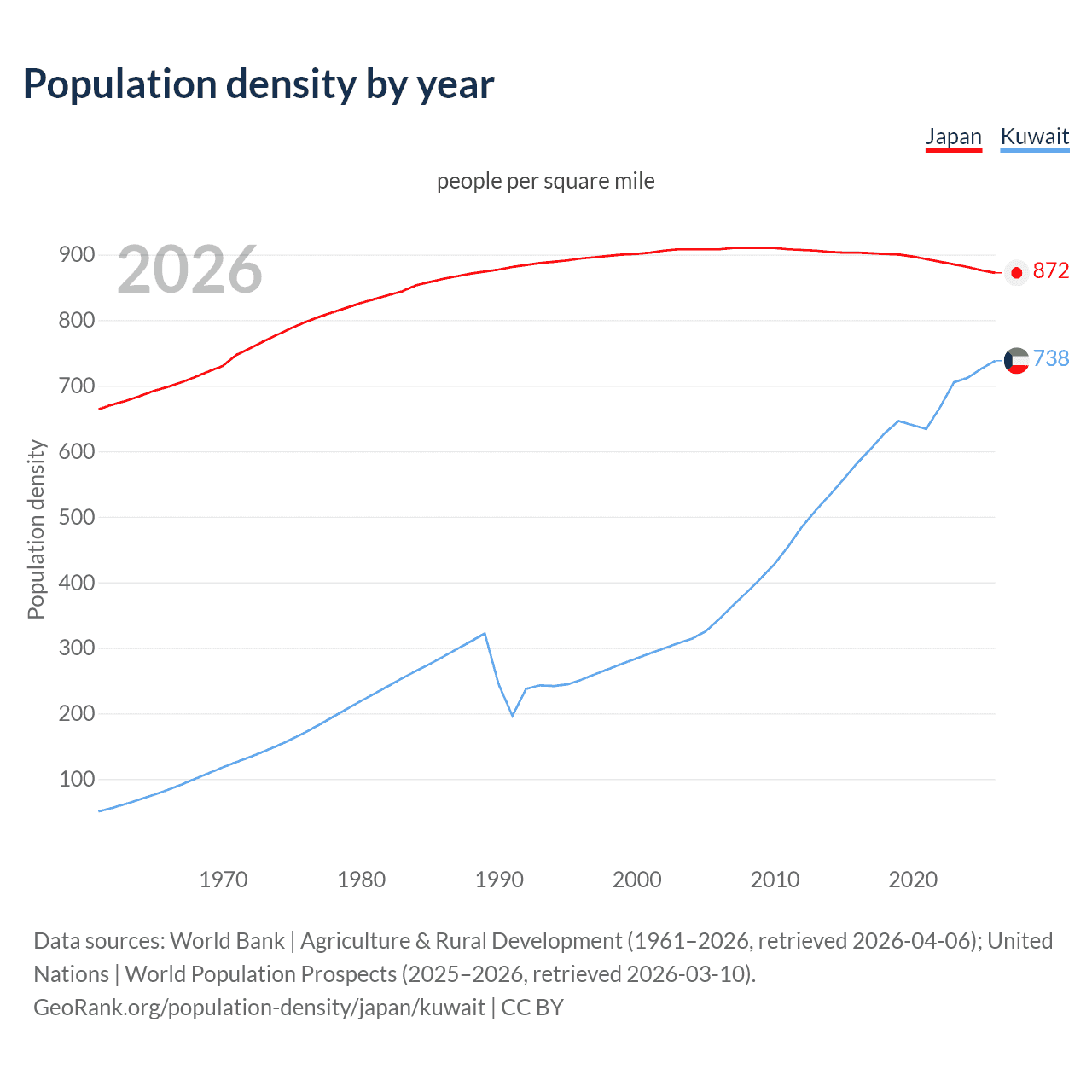 From 2006 to 2026, population density in Japan decreased by 4.07%, compared to a 114.9% growth in Kuwait.