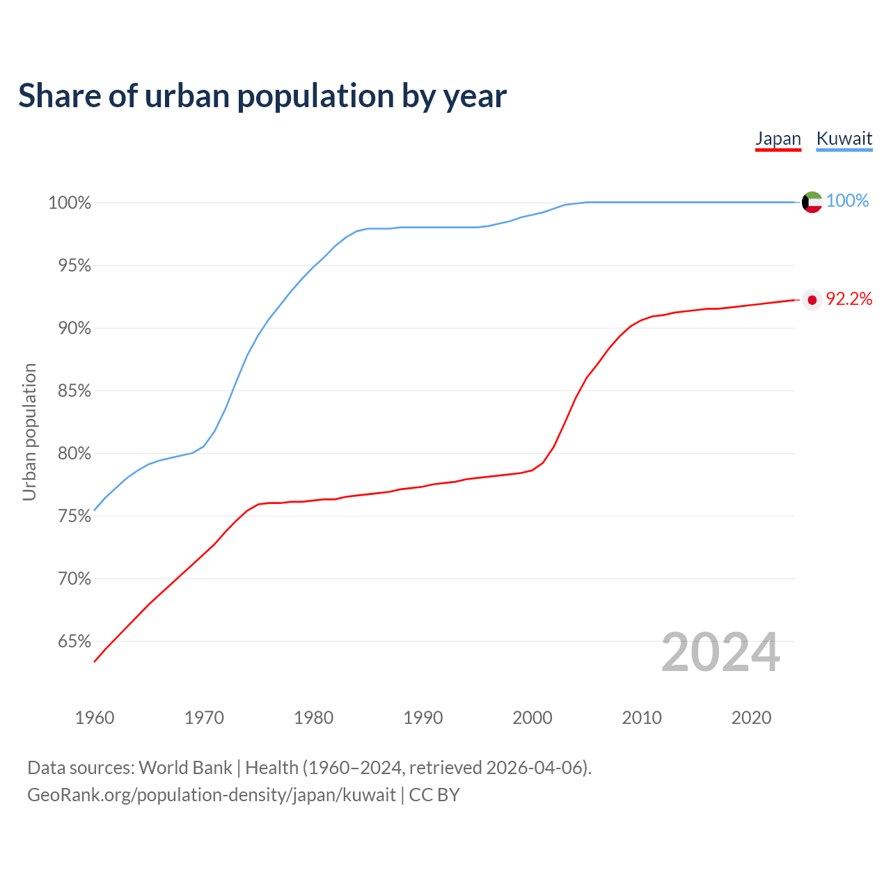 From 2004 to 2024, the share of urban population changed from 84.4% to 92.2% in Japan and from 99.9% to 100% in Kuwait.