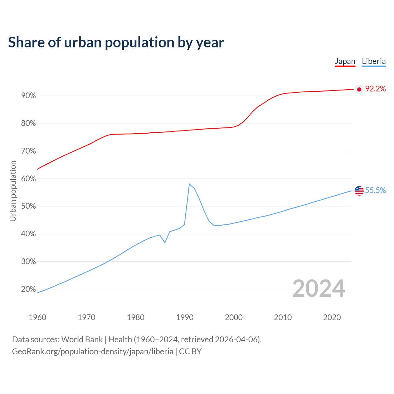 From 2004 to 2024, the share of urban population changed from 84.4% to 92.2% in Japan and from 45.4% to 55.5% in Liberia.