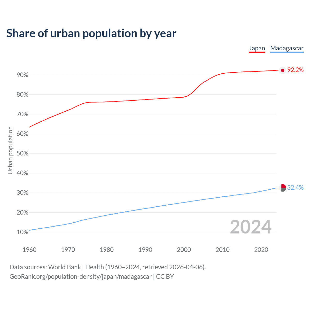 From 2004 to 2024, the share of urban population changed from 84.4% to 92.2% in Japan and from 26.2% to 32.4% in Madagascar.