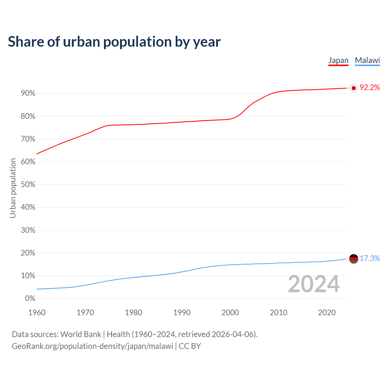 From 2004 to 2024, the share of urban population changed from 84.4% to 92.2% in Japan and from 15% to 17.3% in Malawi.