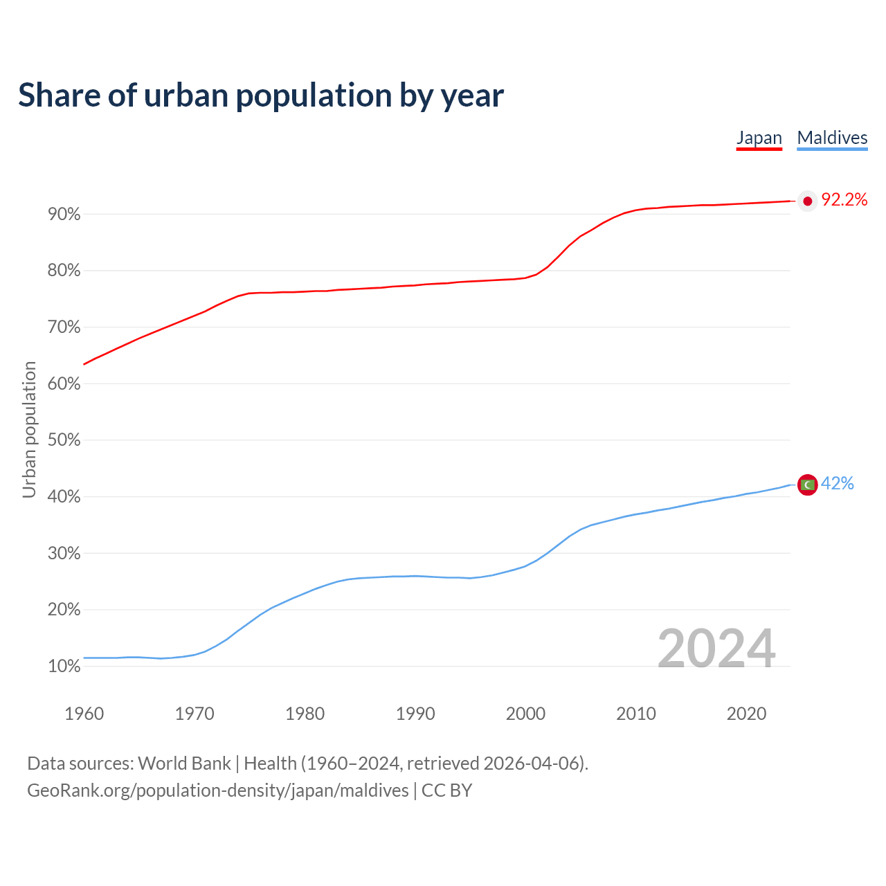 From 2004 to 2024, the share of urban population changed from 84.4% to 92.2% in Japan and from 32.9% to 42% in Maldives.
